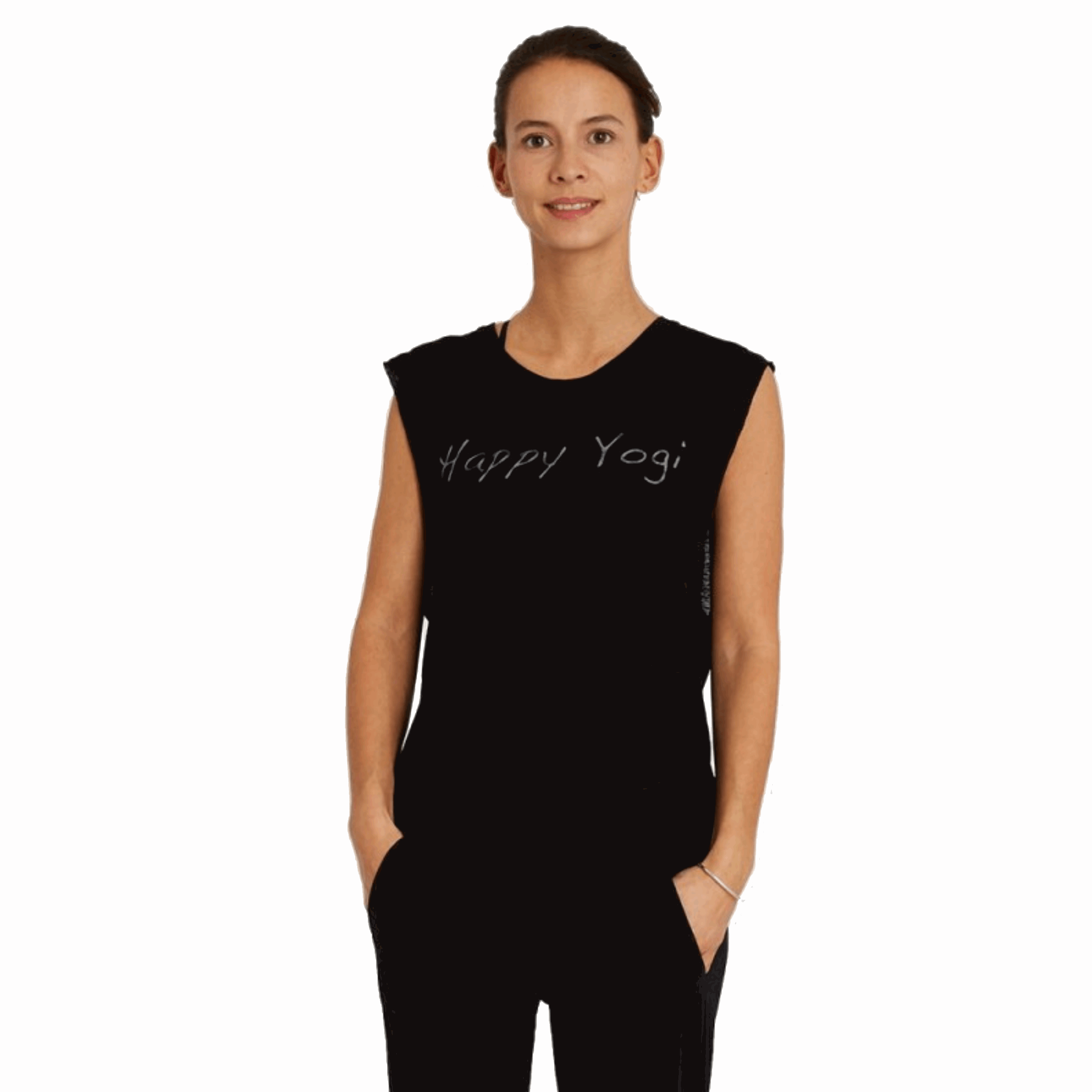 Débardeur de yoga pour femme en forme carrée, avec de grandes emmanchures coupées à crues. Le motif à l'avant : "Happy Yogi sérigraphié". Matière douce en lin.