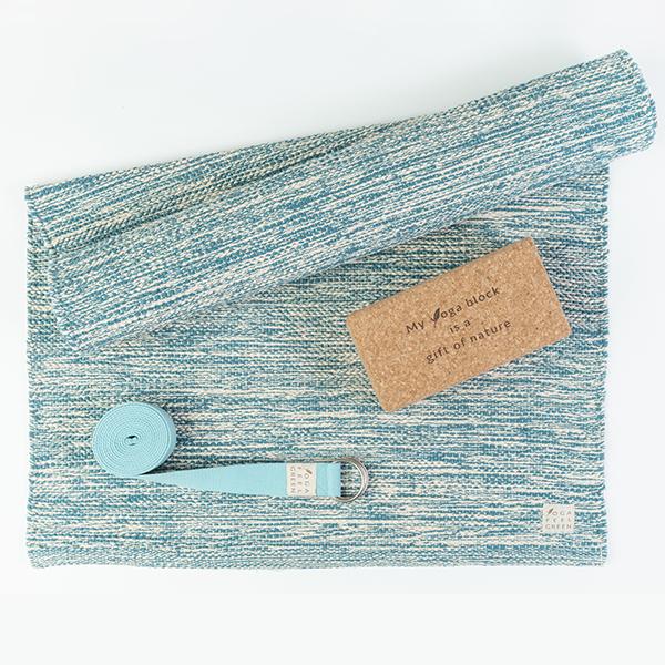 Le pack de Yoga Mysore composé de 3 articles, 1 tapis de Yoga en Coton Bio , 1 sangle de yoga 250, et 1 Block en liège.