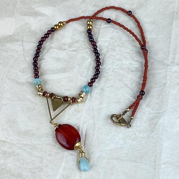 Short necklace inspired by mala, composed of a pendant in Carnelian stone with a small drop in faceted Amazonite. In the center, a brass assembly in the geometric shape of a triangle, from which start, on each side, two round Amazonite stones and small Garnet stones in a row. Finished with orange glass miyuki beads.